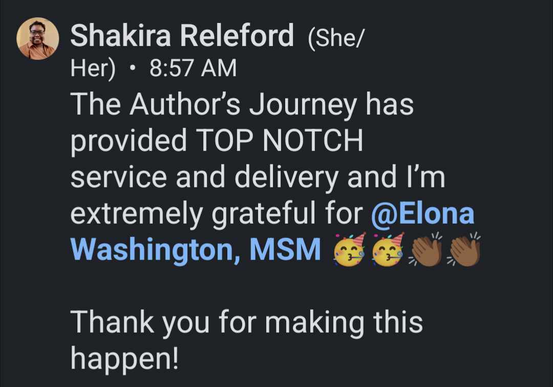 "Thanks for making this process easy. When you said, 'just keep writing; I got you.' I knew you were a winner."
